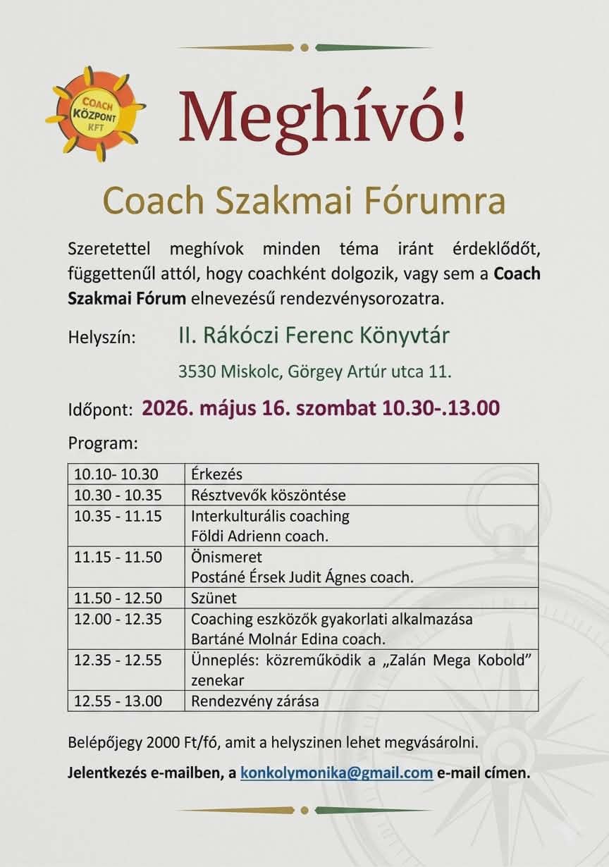 Szeretettel meghívok minden kedves téma iránt érdeklődőt, elsősorban coachokat, a Coach Szakmai Fórum elnevezésű rendezvénysorozatra.